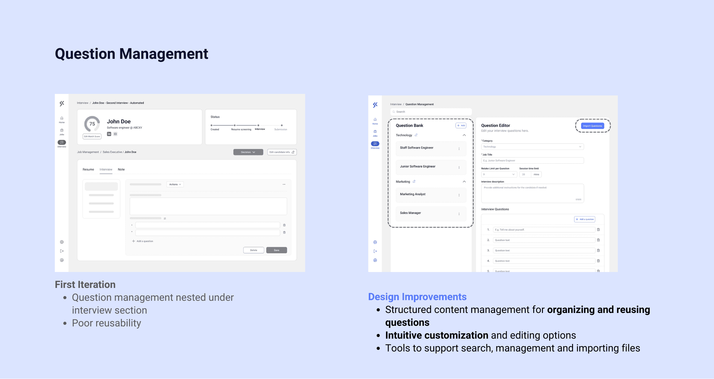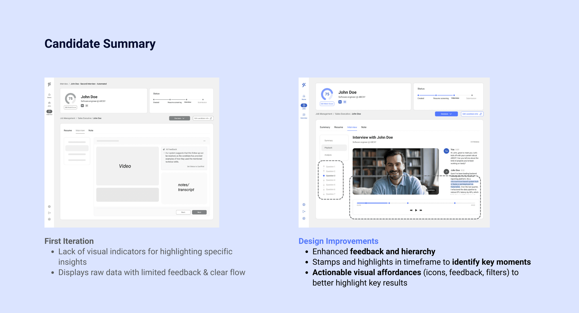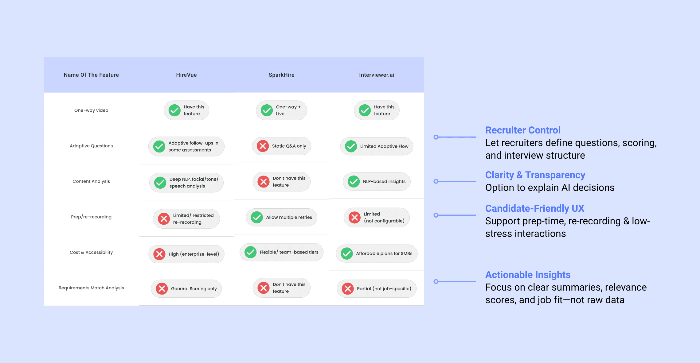 Building on insights from Phases 2 and 3, I conducted a competitive analysis and developed interview questions tailored to staffing agencies’ expectations for the Interview Agent feature.
