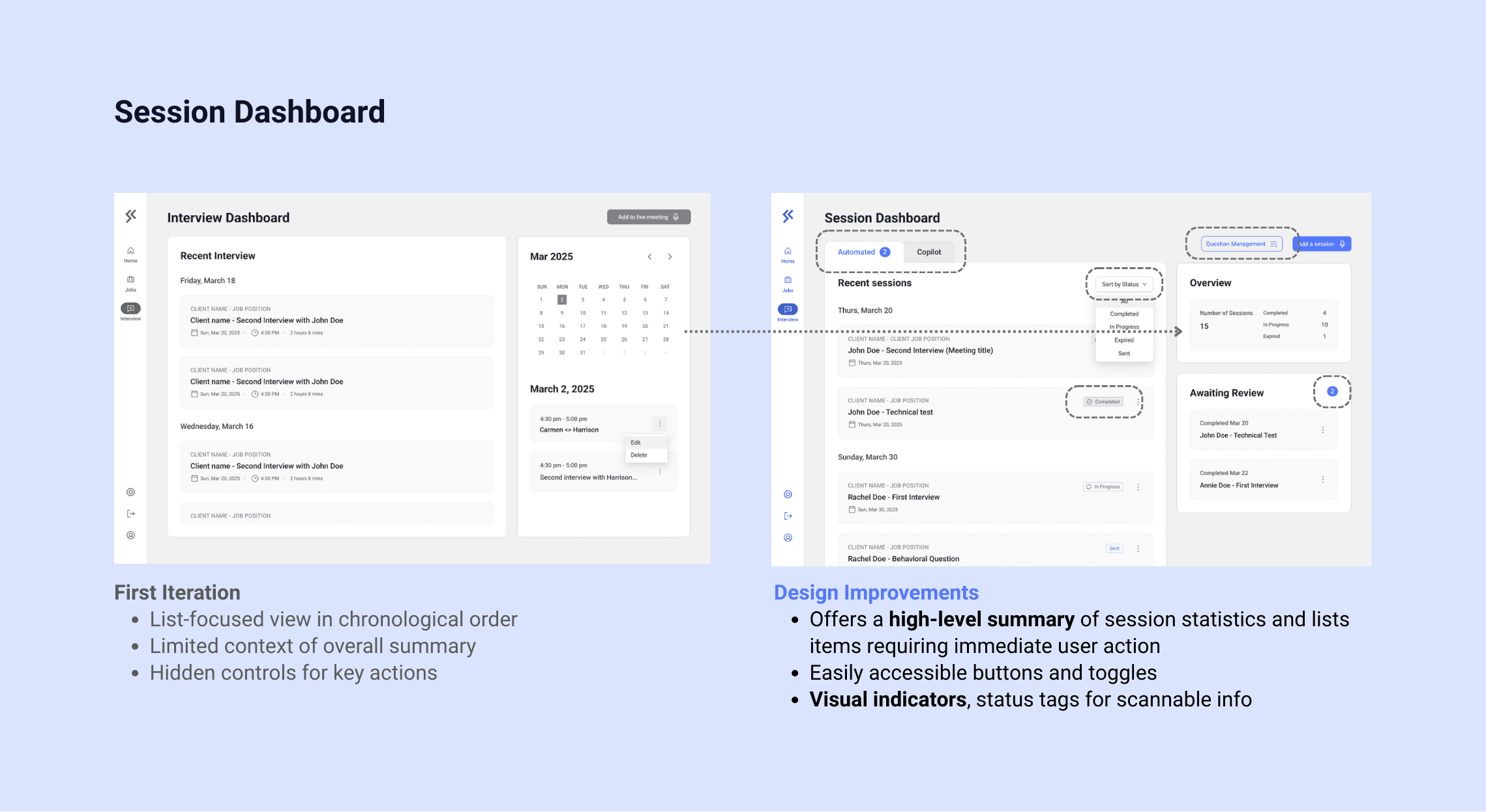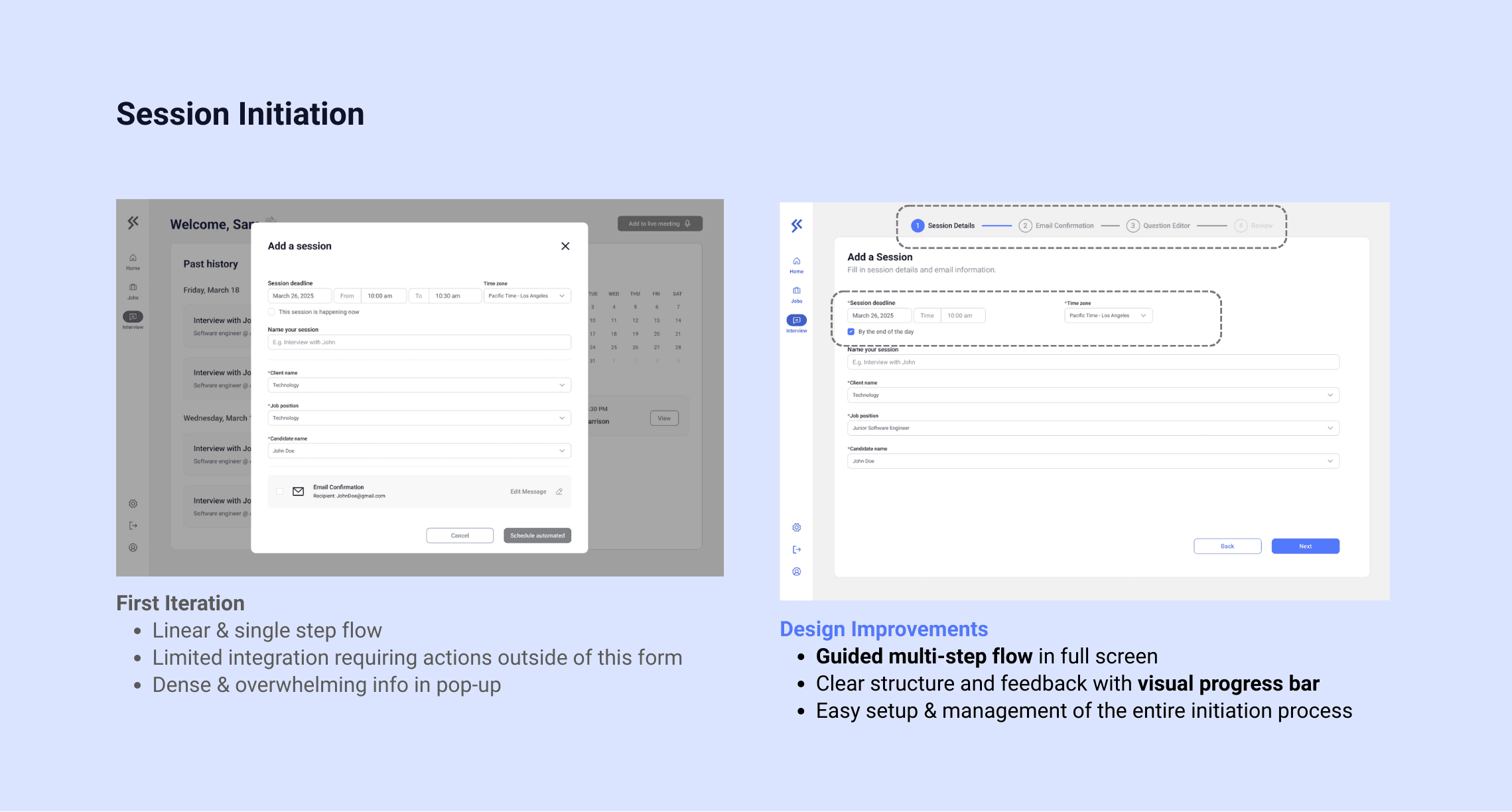 From a business standpoint, the goal was to streamline interview coordination, reduce manual overhead, and increase the throughput of successfully completed interviews — thereby improving placement velocity and recruiter productivity.