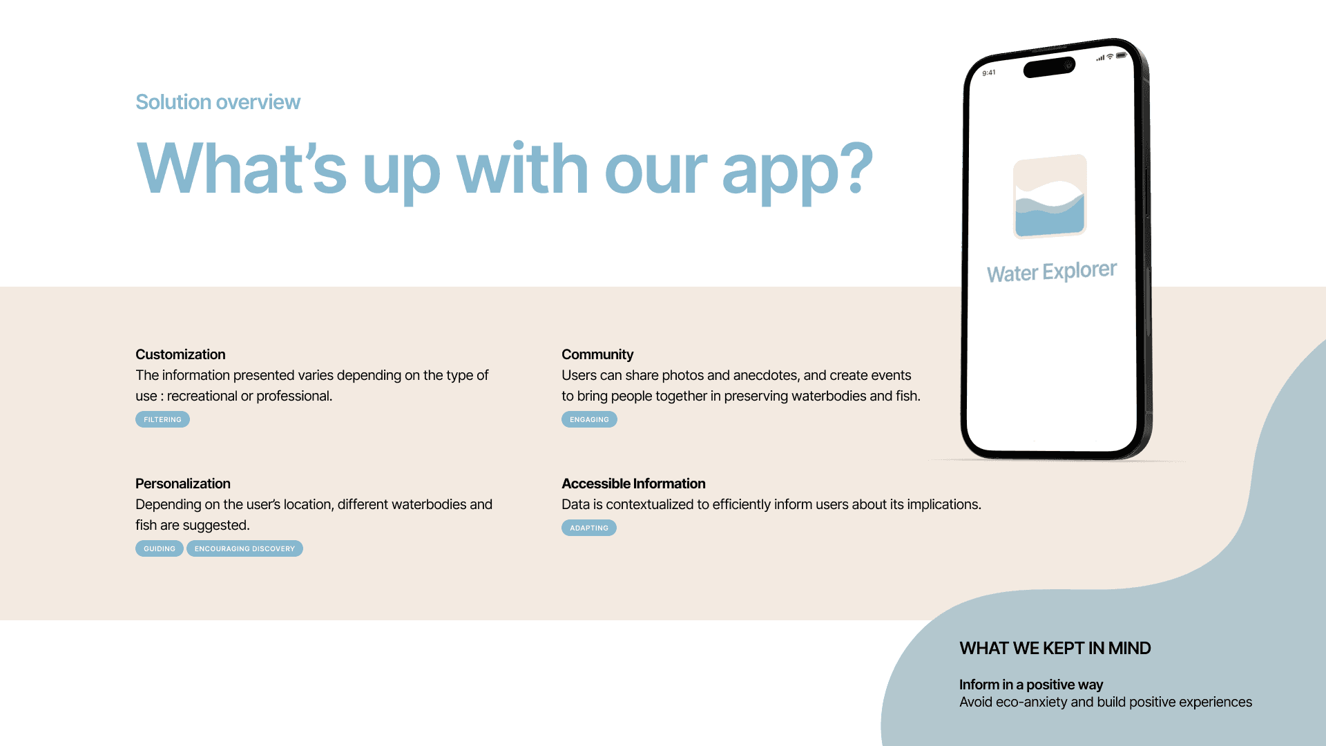 Water Explorer aims to connect communities to local water bodies and aquatic endangered species. We aim to design an interactive platform that informs users of their surrounding waterbodies that accommodates various knowledge levels.