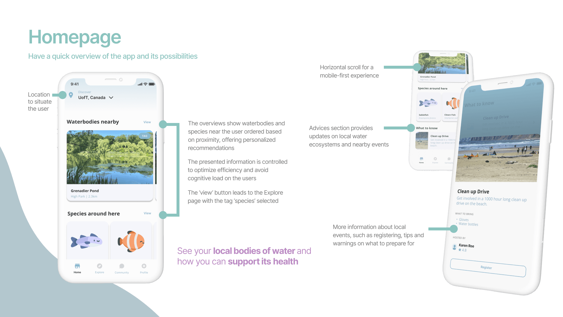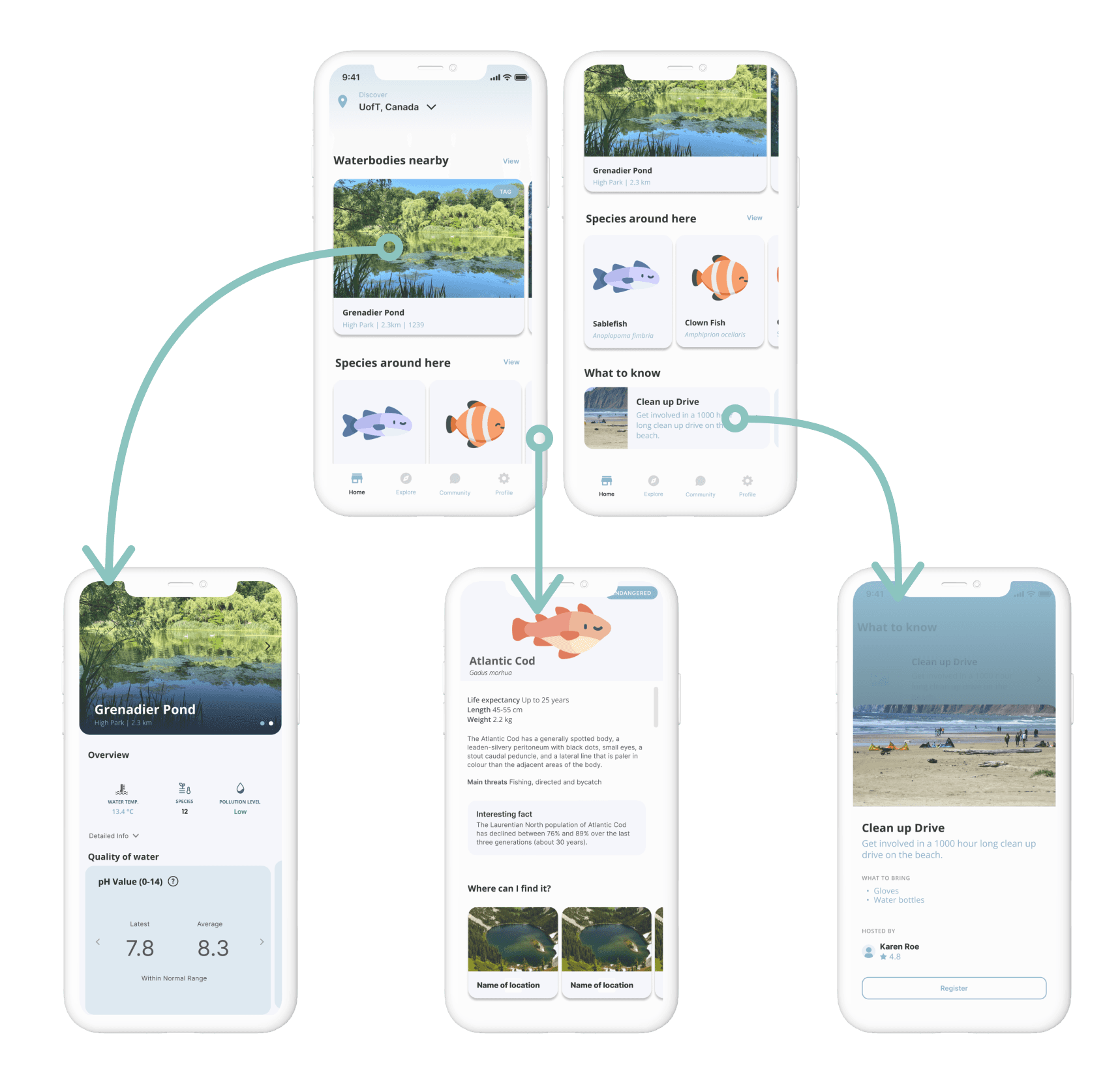 Being mindful of the aims of accessibility and inclusivity, the concept for the app would be to display a curated set of current information based on the user’s location worldwide. Without prior expertise in data processing, our team conducted site-specific research for a sample bodies of water (Grenadier Pond in High Park, Toronto) to populate the prototype interface. Research was also conducted for Atlantic Cod, an endangered species (not local to the water body example) for sample information on the prototype.Water quality parameters reported in the app include:water temperaturepesticide levelheavy metal contentsalinitymicrobiological contaminationpH level